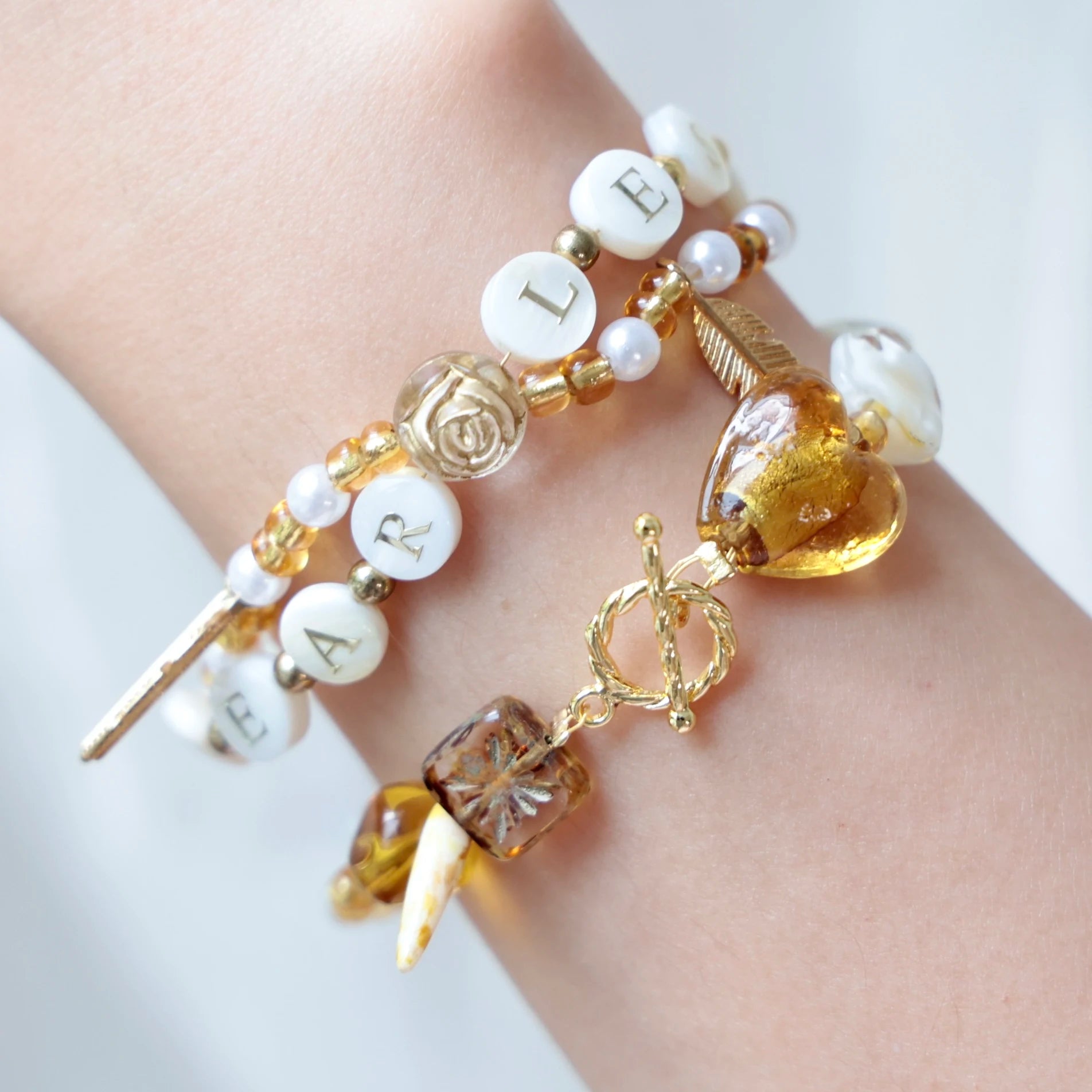 • Mother-of-pearl letter beads, Czech-style glass, and crystal-cut accents